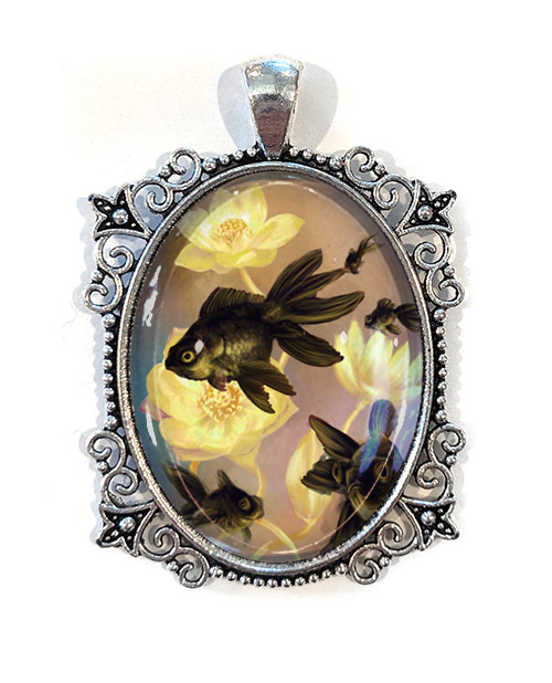 This pendant contains a 3x4cm (1.1 x 1.5 inches) archival quality print set under glass for protection, in a pendant frame made from tarnish resistant zinc alloy.