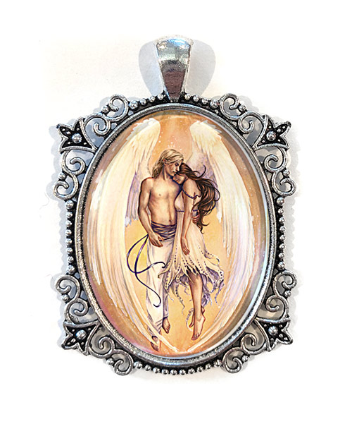 This pendant contains a 3x4cm (1.1 x 1.5 inches) archival quality print set under glass for protection, in a pendant frame made from tarnish resistant zinc alloy.